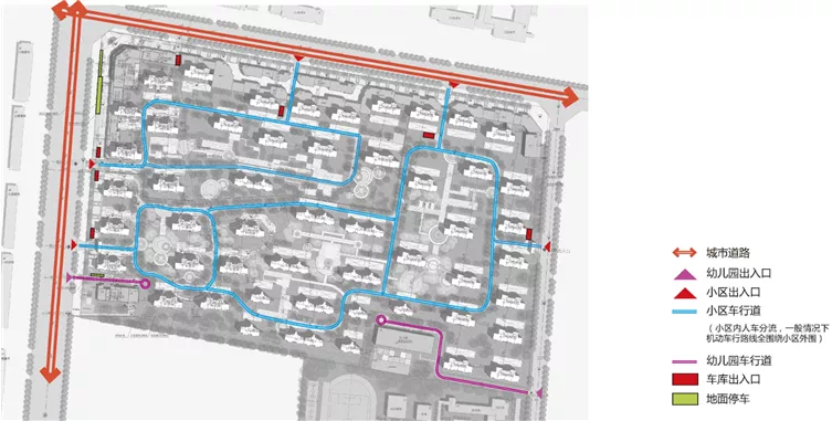 住区规划与西海澜路垂直布置,地块东北角学府东路与海澜路交汇处具有较佳的城市展示面,在该处布置商业最能具有昭示性及商业价值。幼儿园位于地块最南侧,零遮挡,保证了幼儿园较好的日照条件,充分考虑幼儿活动特点,设置丰富的活动场地及绿化。