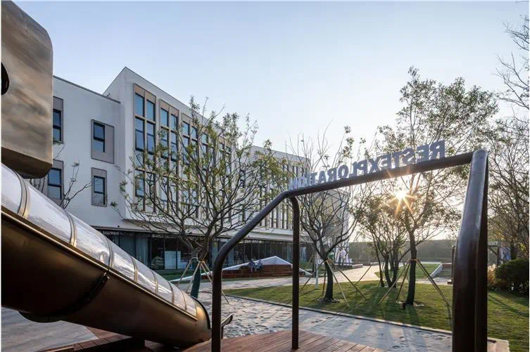 基地整体西高东低,在设计中,利用这一地势高差,顺应城市道路高程,使得道路高程和建筑的高程紧密结合,既节省用地,又丰富景观层次。