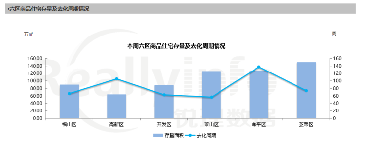 【整体存量】截至本周末,商品住宅存量共计54150套,约646.74万㎡。按近6周的平均去化速度来看,目前全市去化周期约75个周