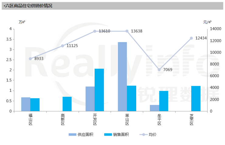 供应方面,本周除高新区、芝罘区,均有新增,主要集中在莱山区,为3.35万㎡,其次为开发区;成交方面,本周开发区成交最多,成交面积2.07万㎡,其次为莱山区1.24万㎡;价格方面,莱山区价格较高,为13638元/㎡;其次为开发区13610元/㎡。
