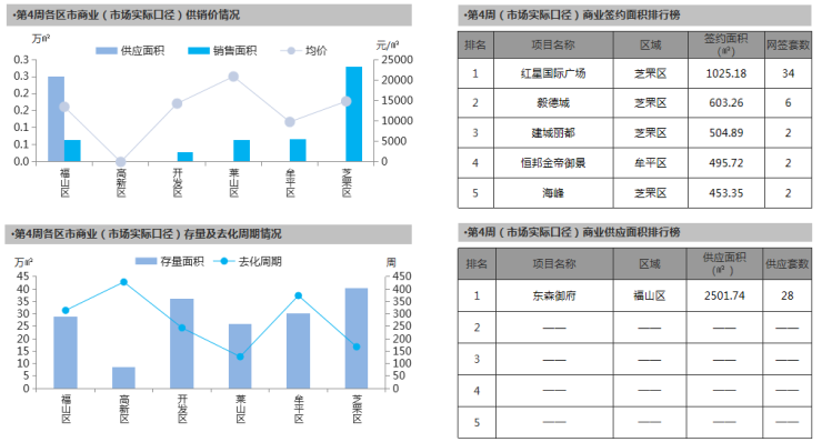 【区域市场】本周商业市场供应主要来自于福山区;存量主要集中于开发区和芝罘区;销量主要来于芝罘区,红星国际广场项目为周度商业市场销冠
