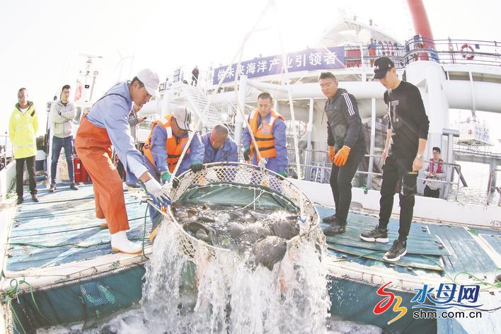 工作人员将一批斑石鲷倒入运鱼船。(资料片)