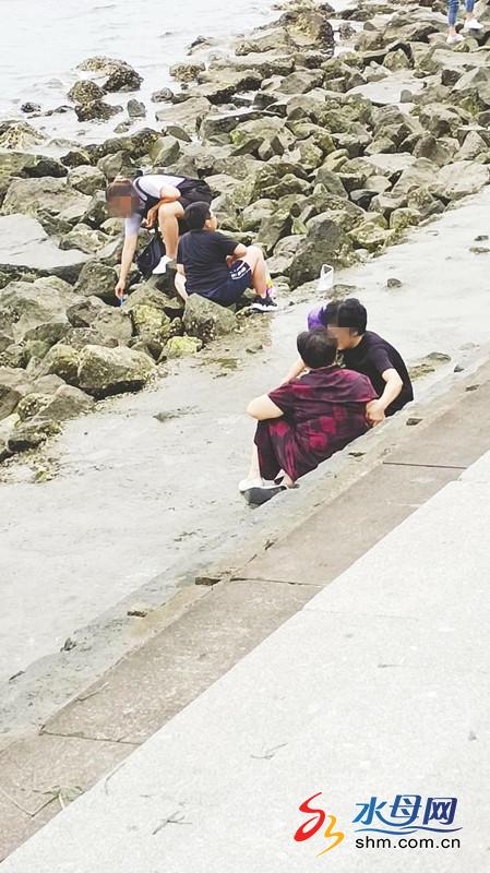 中午12点左右,一位年轻小伙在台阶上不小心滑倒,整个屁股和大腿全部染上了黑色的海藻,手上划破了皮,小伙子疼得龇牙咧嘴。“这一会工夫,有三个人滑倒了。”岸上一位大姨大声提醒小伙子,往上走台阶的时候也要小心。很快,一位十几岁的小男孩想去礁石区,也不小心摔倒,直接从最后一级台阶上摔到了地上。几分钟后,两位年纪五十岁左右的阿姨缓慢走下台阶,他们互相搀扶着,其中一位还是在台阶上滑倒,腰部磕到了台阶上,坐在地下五六分钟都没起得来。不一会,一位抱着孩子的年轻父亲,走到台阶上。虽然在旁边市民的提醒下,已经知道了台阶非常滑,这位父亲走得也十分小心,但还是猝不及防地滑了一跤,为了保护孩子,这位父亲小腿被石头划伤,孩子吓得大哭起来。