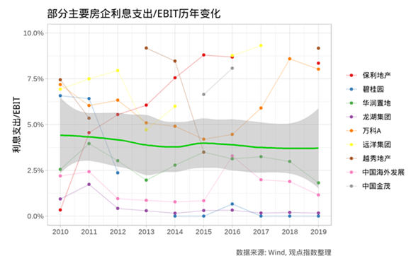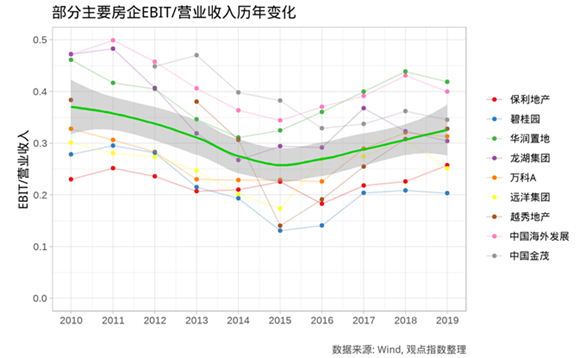 这点可以通过历年部分重点房企EBIT/营业收入变化中看出,EBIT的占比经历了先下降后上升的过程,也进一步对应了房地产行业扩张加速再减速的过程。