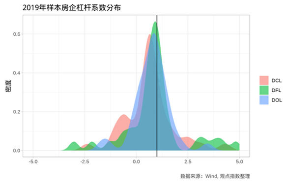 根据观点指数对样本企业2018-2019年财报数据的计算结果显示,约一半以上的样本房企在2019年复合杠杆系数(DCL)不及100%,这意味着大量的样本房企没能让每股收益的增幅(百分比计)超过收入的增幅。