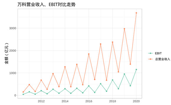 以万科为例,总营业收入及EBIT的对比走势显示,前者的增长明显高于后者的增长速度,这一现象可能也受到行业逐渐下降的利润率影响。
