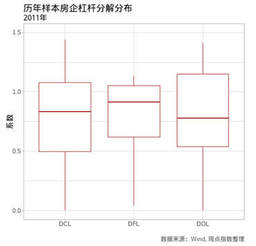 其中,DOL为运营杠杆系数,DFL为财务杠杆系数。从历年样本房企运营杠杆系数分布变化趋势中可以发现,除2017年出现明显上升外,该系数历年的分布变化不大。值得注意的是,多数房企长期经营杠杆系数小于1,这也意味着,EBIT对于营业收入的弹性较低。