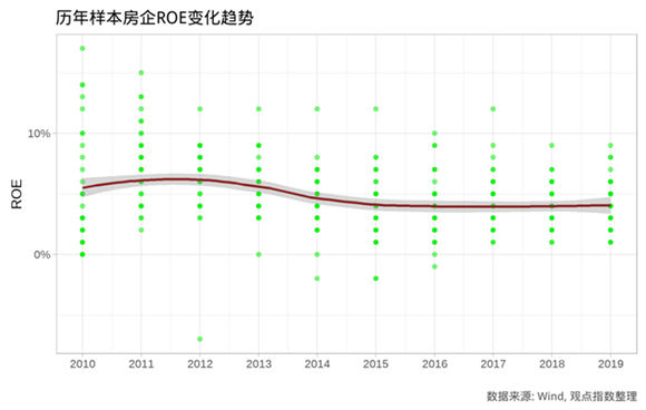 根据历年房企财报数据计算ROE可发现,自2015起,房企的整体ROE水平开始保持平稳,即便与2011、2012年的高点相比较,并无显著回落。