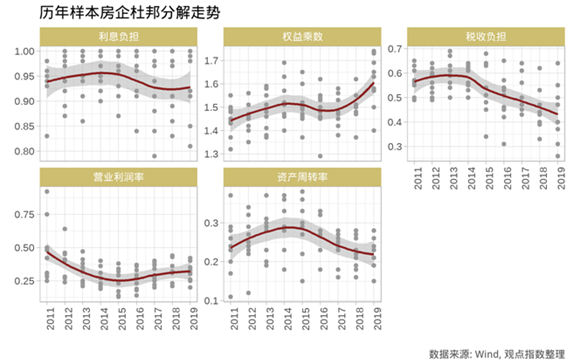 以上分析可以发现,房地产行业在过去十年发展中,并没有通过杠杆的使用扩大权益回报率,很大程度上是在维持10年前的权益回报率。