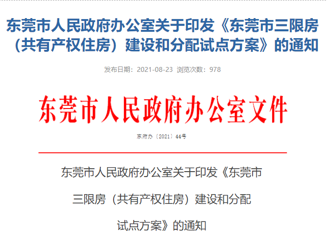 8月23日,广东省东莞市政府印发《东莞市三限房(共有产权住房)建设和分配试点方案》(以下简称“《方案》”),其中指出,“三限房”项目坚持商品住房属性,以限房价、限地价、限销售对象为原则。