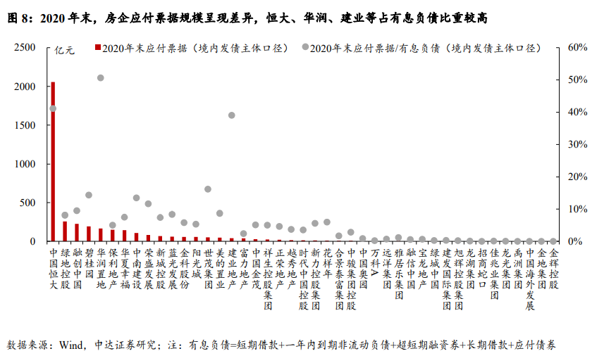 据中达证券统计,2020年末,43家主流房企境内发债主体应付票据合计3968亿元,其中恒大地产应付票据2057亿元(根据21恒大01的募集说明书,公司“应付票据基本主要为商业承兑汇票”);绿地、融创应付票据均超过200亿元,碧桂园、华润、保利、华夏幸福、中南建设等应付票据介于100亿-200亿元。