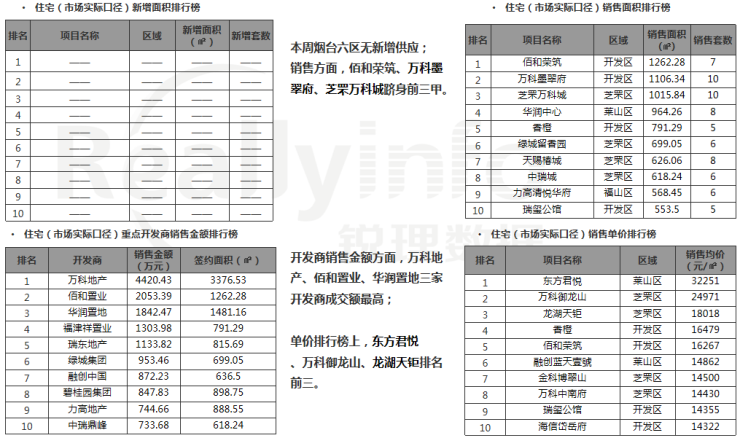 【区域市场】第八周商业市场无供应;存量主要集中于开发区和芝罘区;销量主要来自于芝罘区,西山华庭项目为周度商业市场销冠