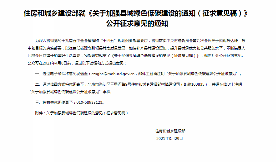 红星新闻3月30日消息,3月29日,据住房和城乡建设部官网消息,住房和城乡建设部29日发布通知,就加强县城绿色低碳建设公开征求意见。通知提出,要限制县城居住建筑高度,县城新建住宅以6层为主,6层及以下住宅占比应不低于75%。县城新建住宅较高不超过18层。确需建设18层以上居住建筑的,应严格充分论证,并加强消防应急、市政配套设施等建设。