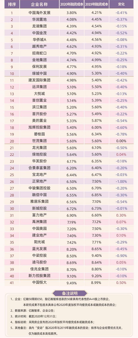 据亿翰智库发布的2020年E5房企融资成本情况来看,平均融资成本在5%以下的房企有11家,平均融资成本在5%-6%之间的房企有11家,平均融资成本在6%-7%之间的房企有9家。此外,平均融资成本超过7%的不在少数,包括禹洲集团、中国奥园、阳光城、蓝光发展、中梁控股、迪马股份、佳兆业集团、新力控股等,这些房企融资成本依然处于高位,其中,佳兆业融资成本高达8.7%,新力控股更是超过9%。