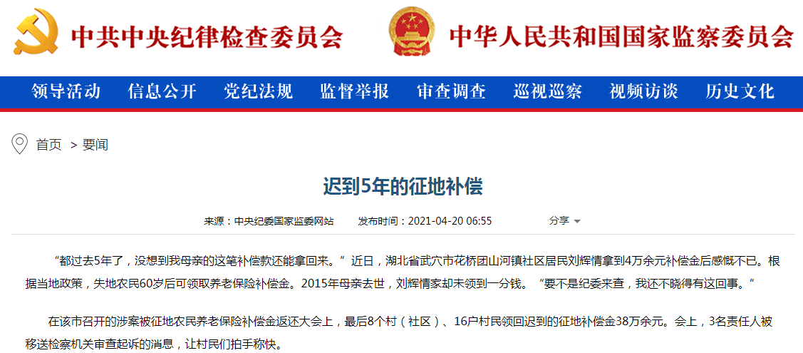 据中央纪检委国家监委网站,在该市召开的涉案被征地农民养老保险补偿金返还大会上,最后8个村(社区)、16户村民领回迟到的征地补偿金38万余元。会上,3名责任人被移送检察机关审查起诉的消息,让村民们拍手称快。