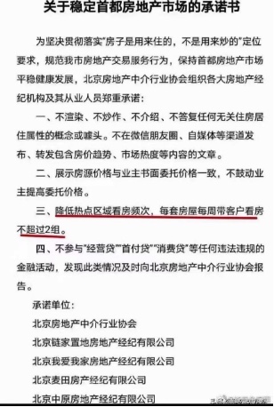 该承诺书中,除倡导各大经纪机构不得参与违法违规的房地产金融活动外,还对北京市热点区域的房产中介带看提出“降低热点区域看房频次,每套房屋每周带客户看房不超过2组”的要求。